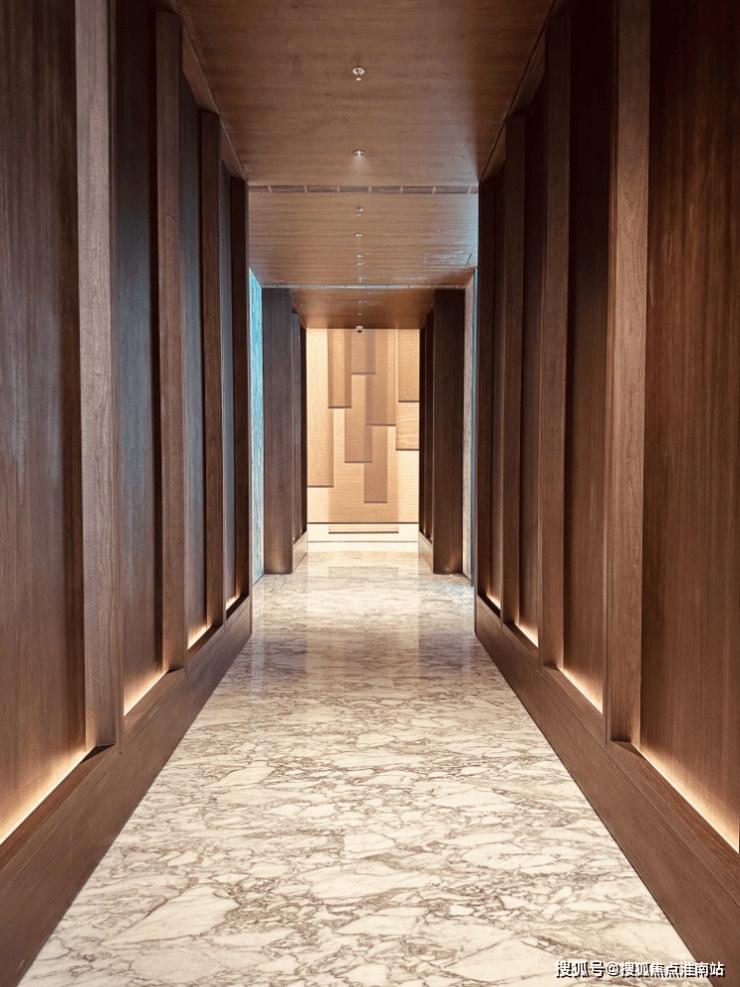 进门右侧,是通往整个下沉式会所的地方,深色胡桃木通铺墙面,质感厚重典雅。整个下沉式会所,以庭院为景观核心,这种环绕式的设计,几乎在任何一个会所的功能空间,都能正对中央景观。