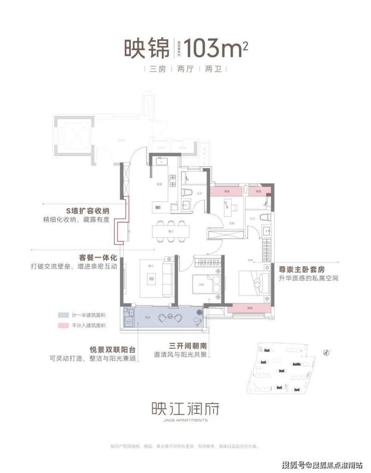 建筑面积约103㎡三房两厅两卫,不失为改善家庭的首选。其中边套户型,映江润府的主卧套房做了 270°环幕飘窗,实现无与伦比的采光通风和视野享受,类比于千万级豪宅的体验!