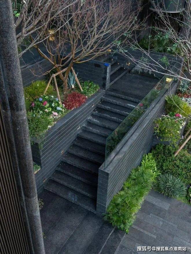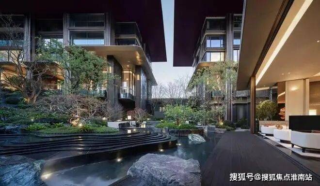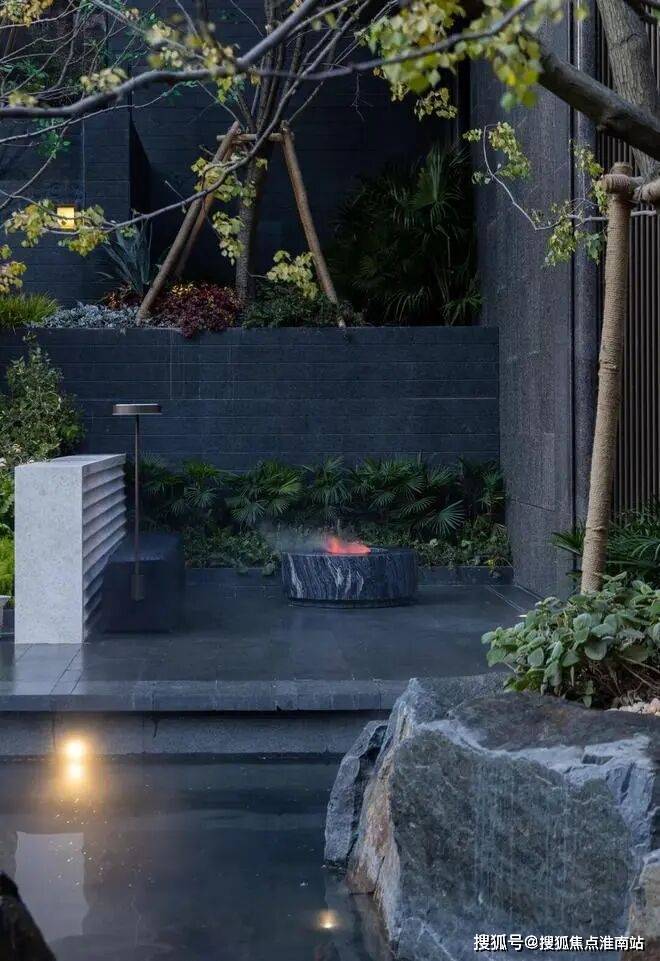 而在3、5号楼之间,则搭建了【围炉夜话】场景空间。古木纹奢石砌成的火炉旁,整木炭化石凳散发着山林野趣,一株红舞姬枫树翩然伴舞。冬日傍晚,好友围坐,体会名门温情。