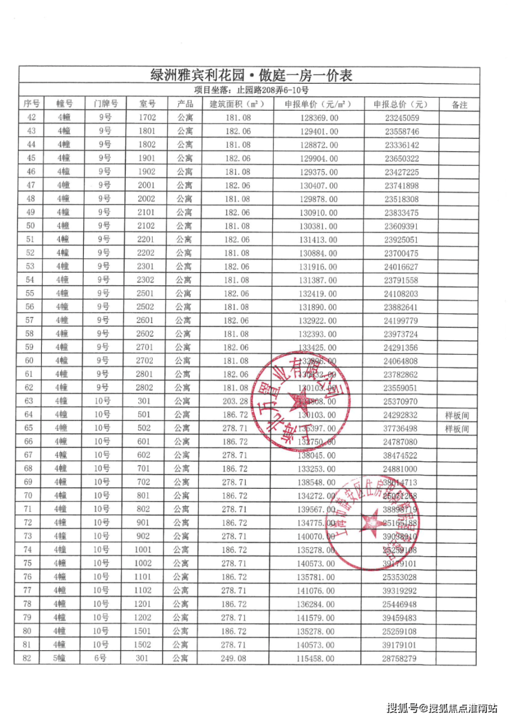 上期一房一价表如下: