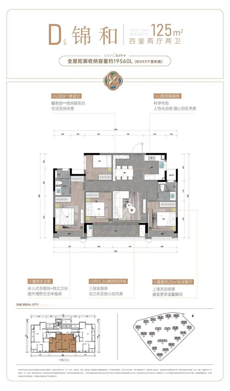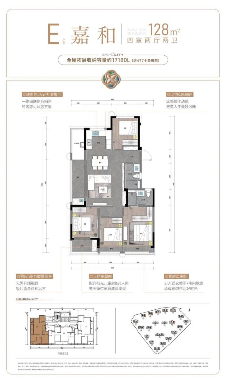 除了朝南的主卧套房、双次卧,北边还可打造出书房或功能房,满足孩子的学习和兴趣培养;如果家庭不断成长,4个房间也足够满足业主不断进阶的需求。