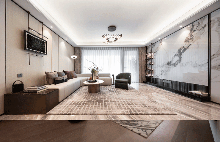 在精工细节上,岩板电视背景墙、定制成品餐边柜、主卧皮革硬包背景墙……处处体现出精致与奢华的居住品质。