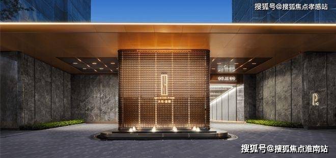 地上大堂,单元门厅雨棚采用香槟金弧面铝板、立面干挂爱马仕灰蜂窝岩板,岩板上嵌入专属楼栋号,单元门两侧弧线段金属采用定制模具加工。