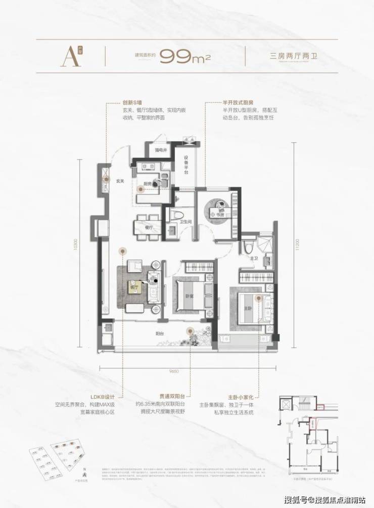 建面约129平方米四房两卫和99平方米三房两卫的户型,也都各有亮点。前者具有宽屏大横厅和约9.1米跑道阳台,后者也具有约6.35米的起步双联阳台,视野开阔。