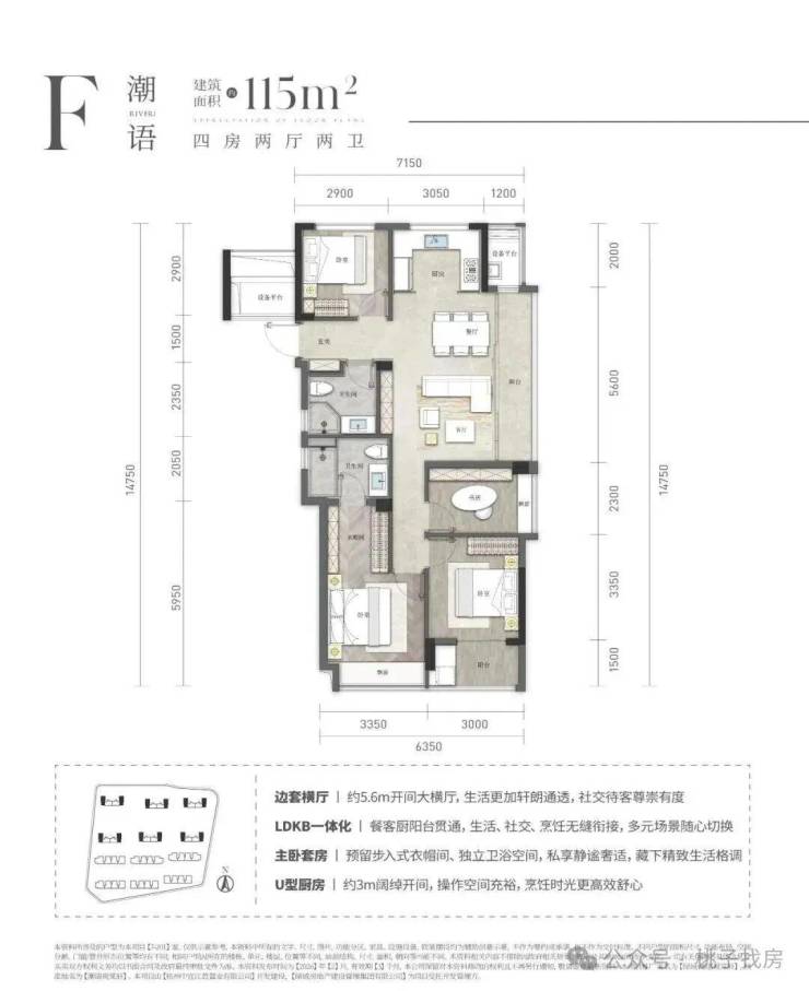 115㎡:4 室 2 厅 2 卫,边套5.6 米横厅,U 型厨房,主卧套房