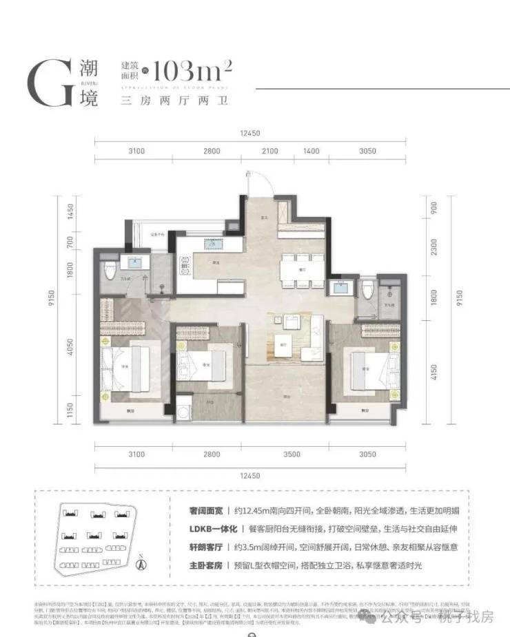 103㎡:3 室 2 厅 2 卫,四开间朝南,南向面宽约12.45 米,LDKB 一体化