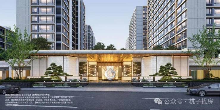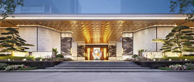 入口处设有约40米星级酒店式归家大堂,搭配罗汉松、朴树及潮水雕塑,营造仪式感。