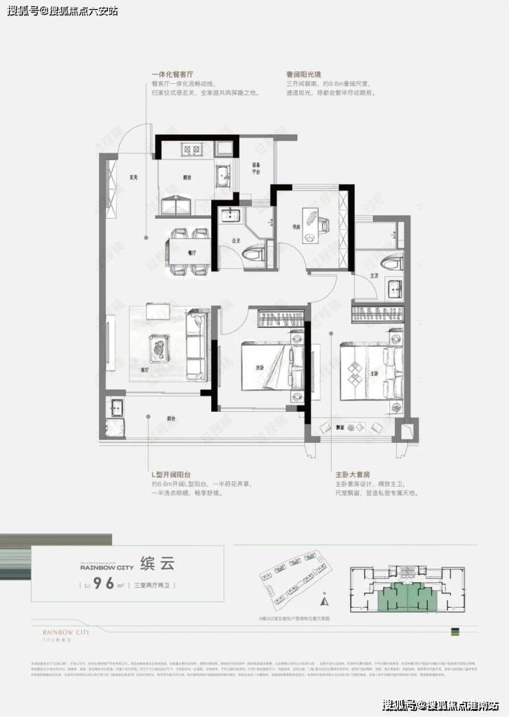 约96㎡户型采用三房两厅两卫布局,拥有约9.8米南向尺度,约6.6米开阔L型阳台,一体化餐客厅设计,使空间显得宽敞明亮。主卧配备独立卫浴与衣帽间,飘窗设计将风景引入室内,在有限面积内实现舒适居住体验。