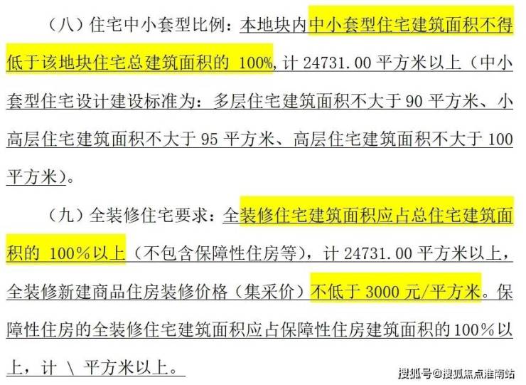 装标不低于3000元/平,中小套比例不低于100%,全装修比例为100%。