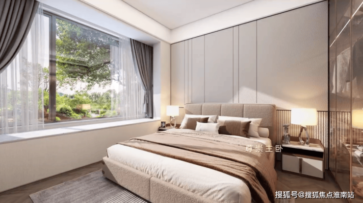 同时主卧面宽也有约3.3米,与百平米高层相当,整体空间足够放得下1.8米的大床和两个床头柜。
