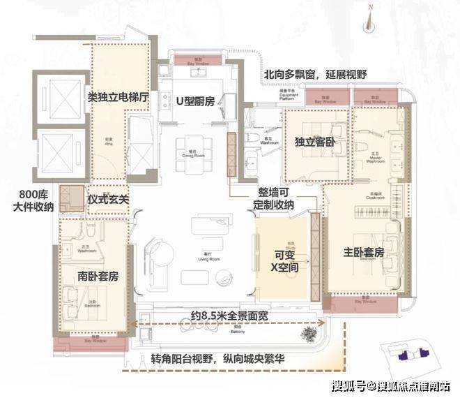约15.4米宽幕观景视野:洄游动线自由灵活,约8.5米巨幕阳台,城市心脏均在脚下;