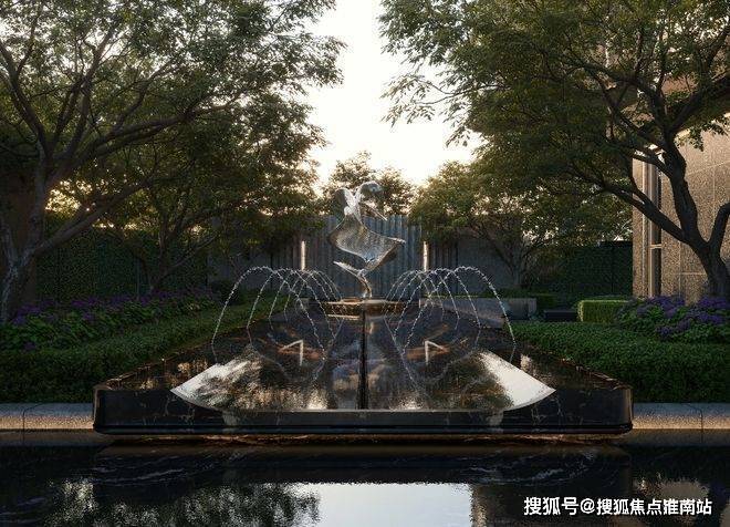 前场花园以兰特庄园为设计灵感,明确的中央轴线贯穿,中心喷泉顶端放置了应晶晶的山海金阙,以秩序中的自然理念通过几何布局、水景艺术和人文符号加功能美学,与哲学融为一体。