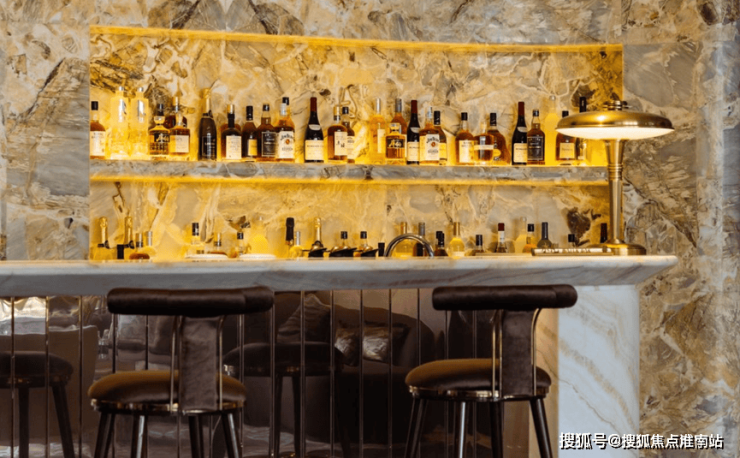 鎏光水吧会客厅,吧台背景采用梵克雅宝奢石,每块纹理独一无二,尽显珠宝陈列美学,可供业主未来会客使用。