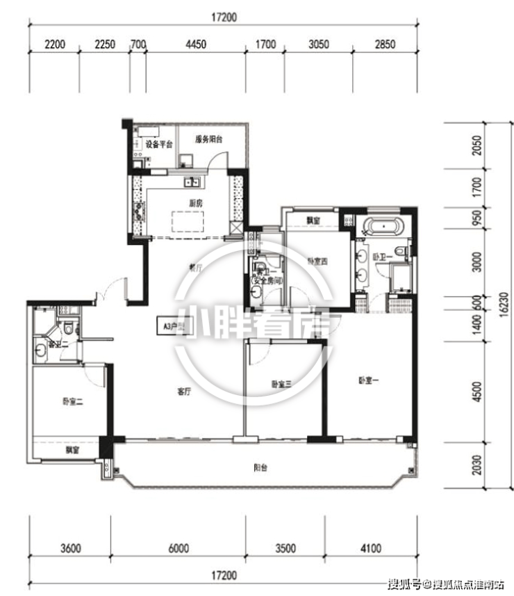 这一户型是4房2卫设计,户型格局上与上个户型是很相似的,不过南次卧没有内卫。