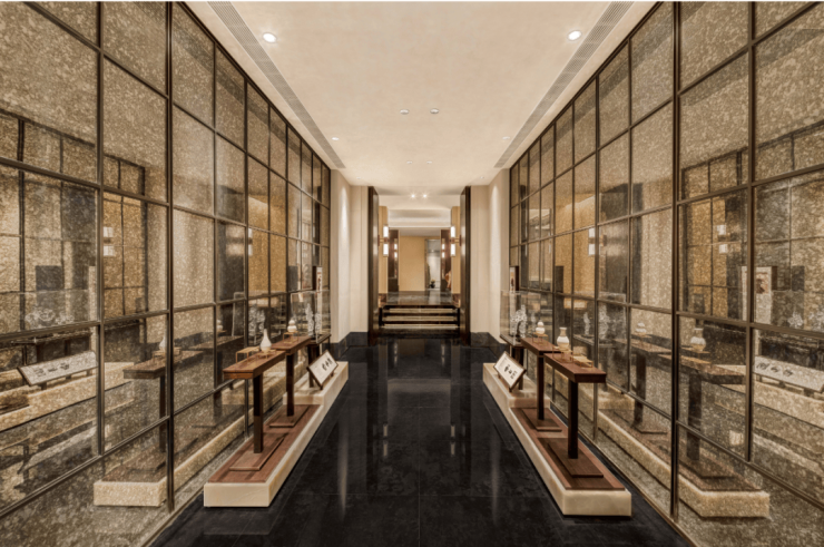 文化细节随处可见,苏式的瓦片(墙面)、屋脊(天花造型)、清波(石材波浪、水纹玻璃)、桂花祥纹、玉雕苏绣、吴门画派的卷轴造型等,打造沉浸式的苏州立体文化博物馆。