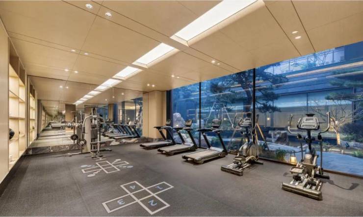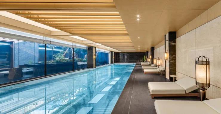 下沉空间,健身房、恒温泳池、私宴厅、会客区等,皆直面庭院景观。