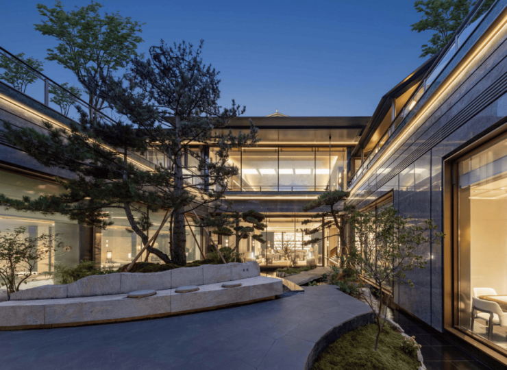 下沉式庭院,以唐寅《双松飞瀑》 为灵感 ,打造当代立体山水。确保从各个视角,都能感受不一样的意境。
