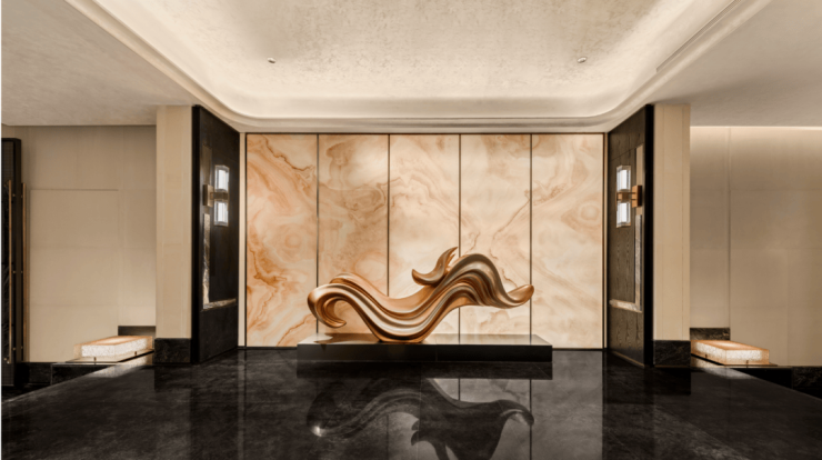 门庭仪式,宽约58米的隐贵大门,太行山的黄金石与迎客油松矗立门前,一整面进口潘多拉奢石打造的透光照壁,带来极强的艺术冲击力。