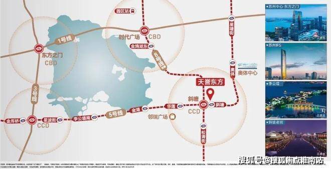 双轨交汇 黄金四角环湖四轨交汇,缔造金鸡湖黄金四角,西北-东方之门、东北-时代广场、西南-李公堤、东南斜塘老街一黄金四角所在核芯价值所向。