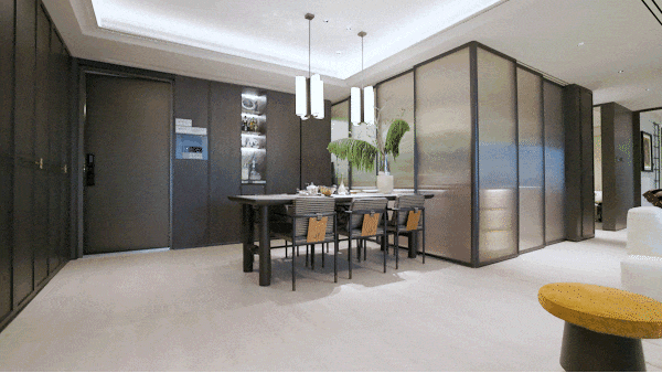 一进|隐园之境:整个翡雲悦府拥有相当宽奢的入户门庭,昂贵的用料、精致的线条与柔和灯光,奢华而有腔调。