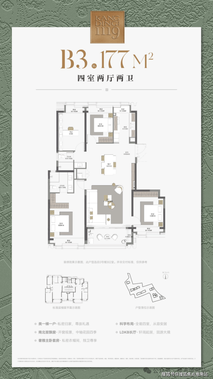 最重要的是,康定壹拾玖这建面约177㎡4房不仅仅是方正,更是飞机户型,三开间朝南+南北通透+无走道的浪费,整个户型相当正气。