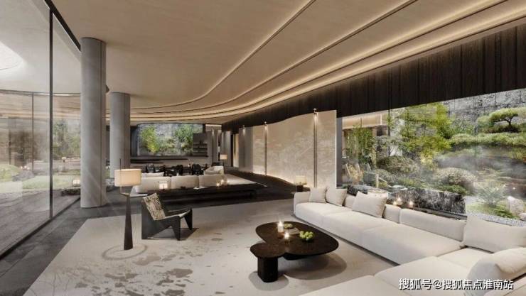 同频中心豪宅的高技墅造,以曲面重定生活边界,立面全采用 Low - E 三玻两腔中空玻璃,创造更静谧境界,展现更舒展的风景交融,三弧立面,会所圆弧廊架,曲水走向,以三位一体的弧线手法,写意出"峯峦曲水画廊"。