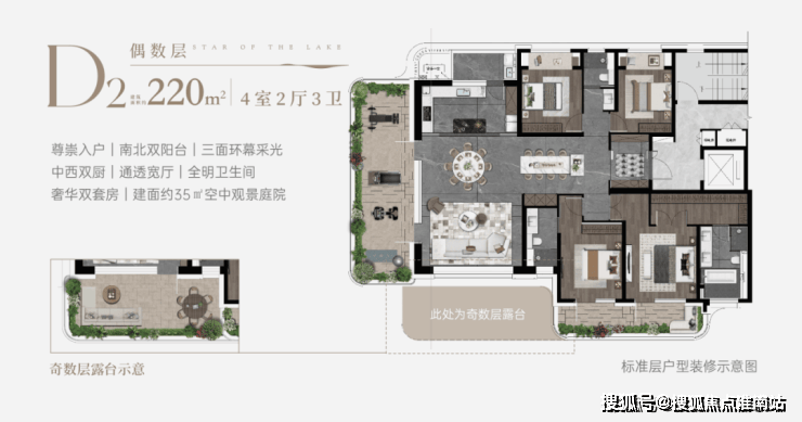 空中庭院与架空层:每户均配备空中庭院,每栋楼均设架空层;露台采用超6米挑高设计,赠送面积约15㎡-35㎡,部分户型配备约270°弧形转角露台,环幕视野,尽揽太湖浩瀚风光。