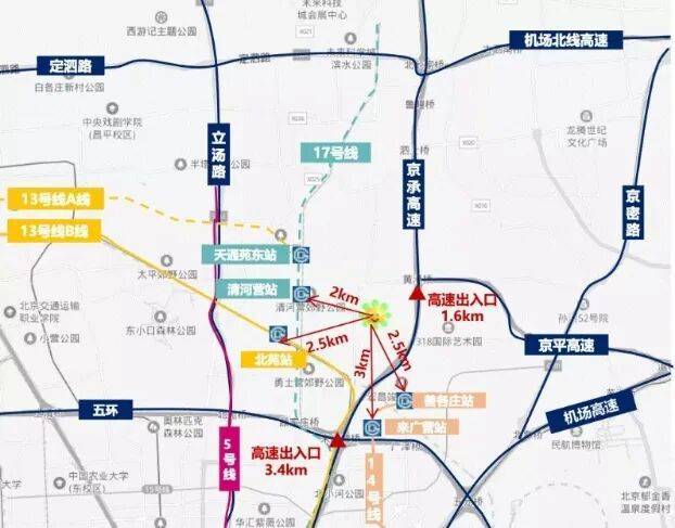 交通方面,项目周边来广营北路、北五环、京承高速、京密路、机场高速等重要干道环绕,驾车出行非常便利,特别是前往望京产业园或周边核心商圈,不堵车、不走高速的情况下20分钟左右即可到达。另外项目周边可触达4条地铁线路,分别是13号线(北苑站)、14号线(善各庄站)、15号线(马泉营站),以及在建的17号线(清河营站),直线距离2-3公里左右,不近不远,打个车过去也方便,算是聊胜于无。