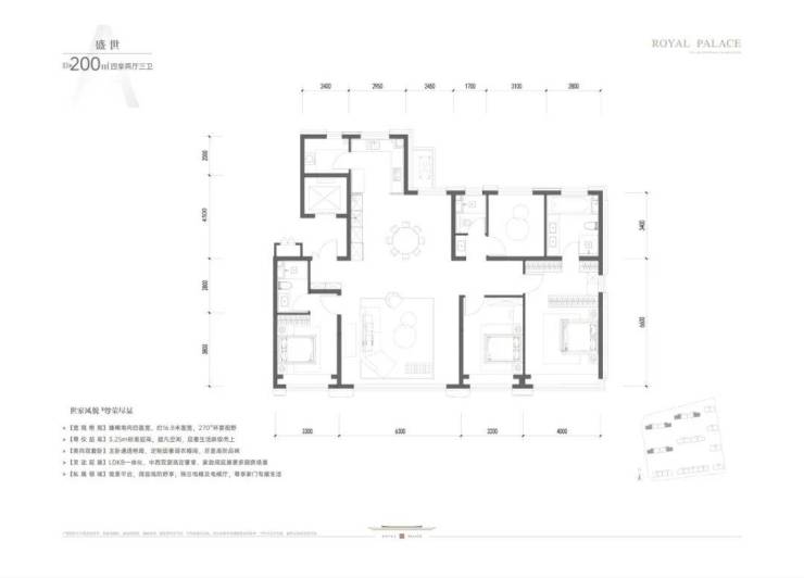 200平米户型,做到了四面宽,可以看做180户型的升级版,以客厅为轴。基本形成了双套房的使用感觉,东侧是主人房空间,搭配儿童房和多功能厅形成一个整体,西侧主要是老人房,三代同堂的理念同时也避免了互相打扰。