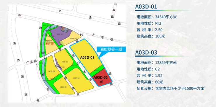 A03D-03地块: 出让土地面积12859平方米,土地用途为商业,规划容积率1.95,计容建筑面积25075平方米。