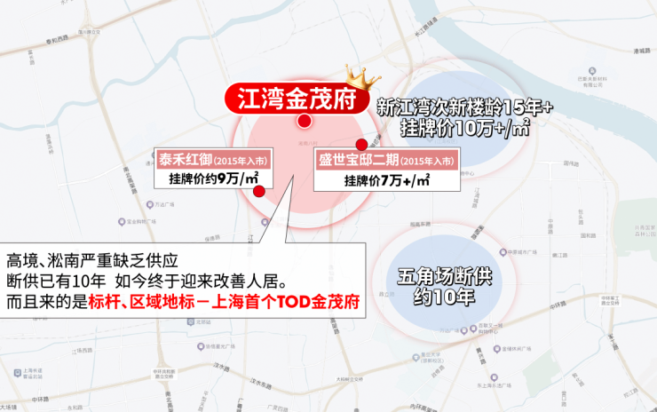 宝山东部片区上一次供应还要追溯到2015年的泰禾红御和盛世宝邸,几近10年断供,这两盘也是目前区域标杆,前者挂牌近9万/㎡,后者7万+/㎡。五角场同样如此,近10年断供;而新江湾次新房龄普遍15年+,挂牌价10万+/㎡,总价很高。