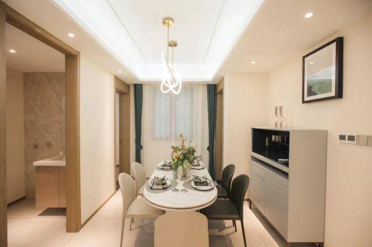 餐厅与客厅相互贯通的完整空间,在增加空间视觉深度的同时,也让家庭成员之间的互动更加多样化,同时与南向阳台相连,将更多的阳光与清风邀约入室,成就宽阔视野,园林美景尽揽。