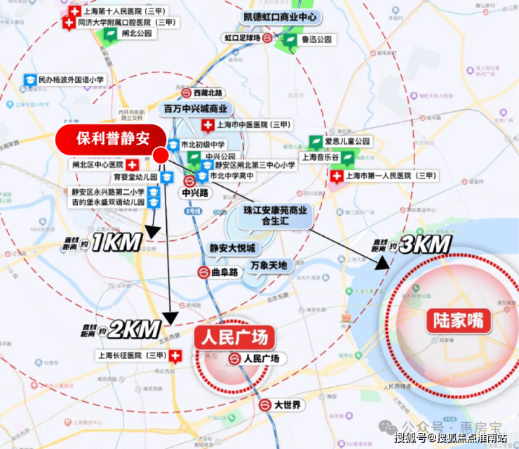 医疗资源方面,项目周边约3km范围内上海市中医医院(三甲) 、上海长征医院(三甲) 、上海市第一人民医院(三甲)、闸北区中心医院、上海第十人民医院 (三甲) 、同济大学附属口腔医院(三甲) 环伺。
