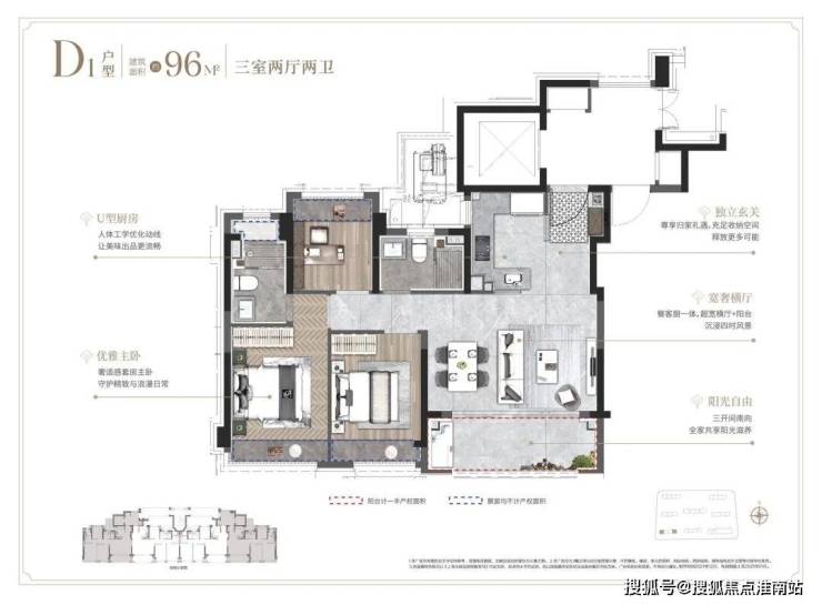 ①建面约96㎡3房户型: