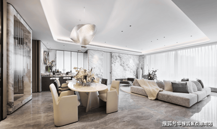 东区建面约320户型,将艺术感进一步融入日常中。特别设计的专属门厅空间,是从电梯厅延伸到家,如同一处艺廊,放慢人的情绪;室内选用了浅金色奢石(外界也称其为“芬迪白大理石”)作为主要的石材,曲面的木饰面也为浅色,整体给人以明亮感。