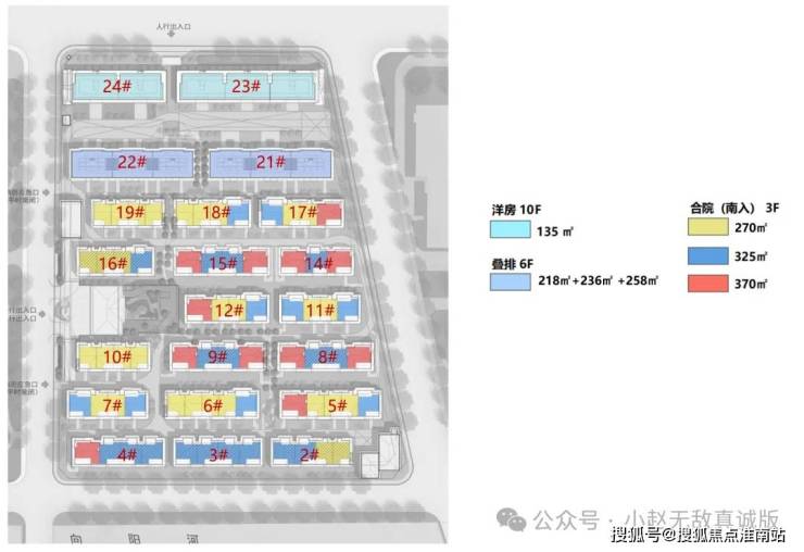 根据规划公示显示,该项目拟建21栋住宅,由南向北,从低到高,保证日照采光,其中17栋3F合院,2栋6F叠加,2栋10F洋房,总户数仅有205户。