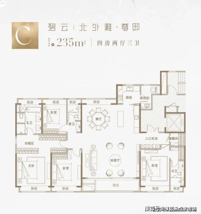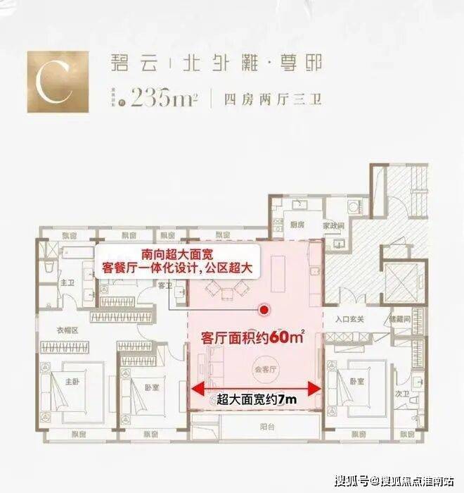 建面约235㎡4房2厅3卫:约7米超大横厅,三卧室朝南,LDKB一体格局,约60平社交会客厅,全屋飘窗通透采光、大尺度景观阳台,超30平至尊套房主卧、双南套房、全明三卫设计、高规格精装标准。