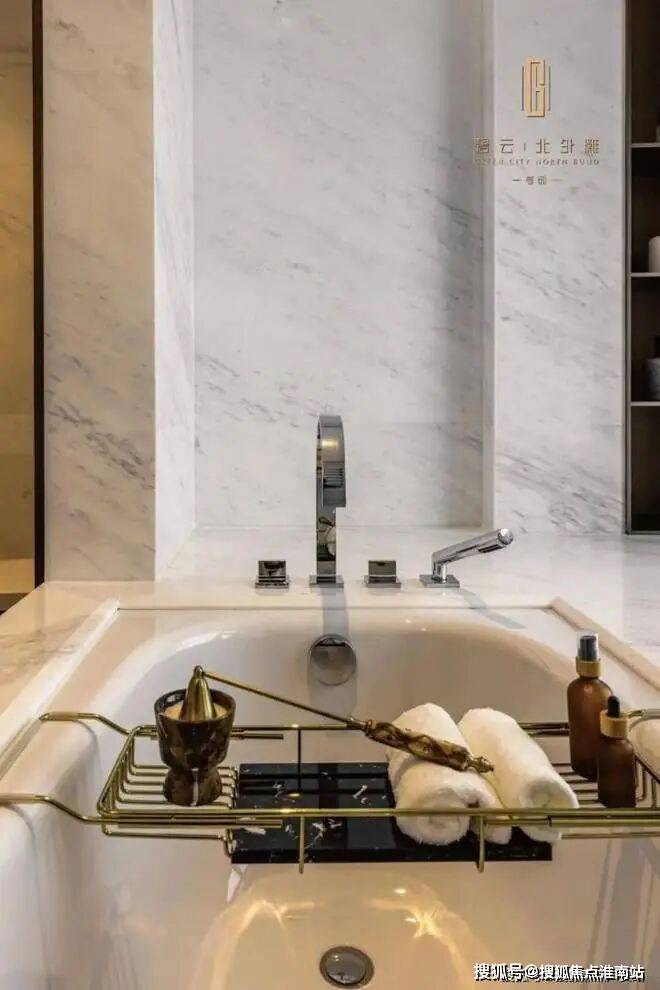 厨卫方面,西厨定制高柜,容纳嘉格纳蒸烤一体机、嘉格纳双开门冰箱、洗手台以及各类收纳空间;中厨自带嘉格纳灶具、油烟机和洗碗机。主卫配置劳芬台盆、浴缸和独立卫浴洁具空间、独立淋浴空间配备当代的花洒,顶部有松下暖风机,还配置了电热毛巾架。