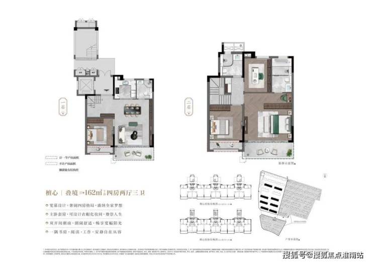 6层组合墅:中轴区采用经典双叠层+平层结构,外围区创新设置三重立体单元
