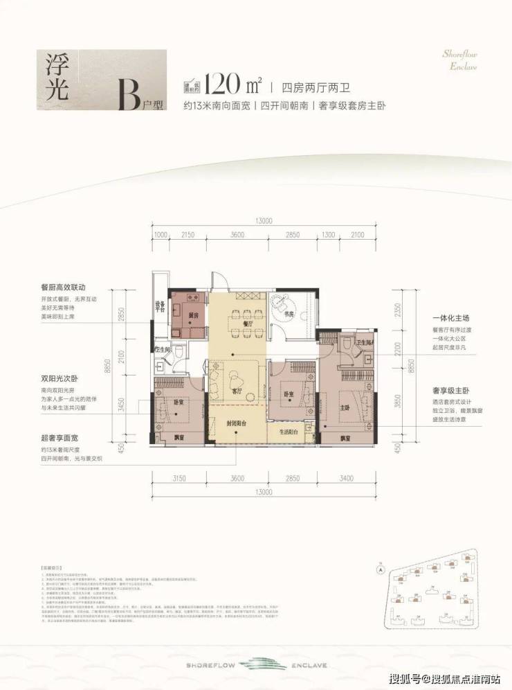 这款户型堪称四开间朝南的“流量王者”,南向面宽约13米,双联阳台+双飘窗设计,视野和采光优秀;套房主卧、双阳光次卧,颇有大平层的气势。