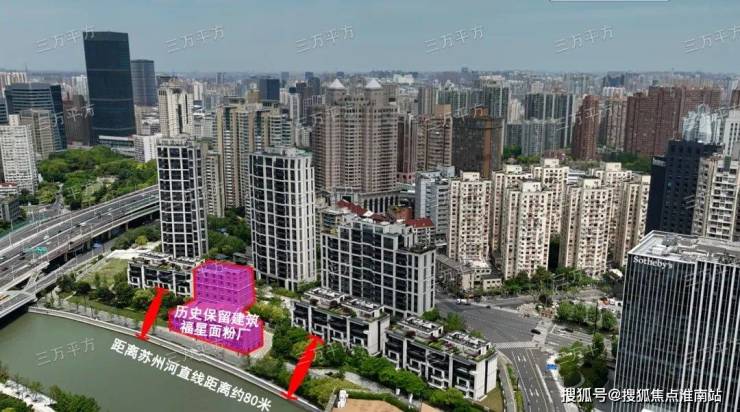三栋叠墅就位于苏州河沿岸。距离苏州河直线距离约80米,前方无遮挡。叠墅中间有一个历史保留建筑——福星面粉厂。