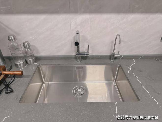 水槽采用的是 铂浪高 不锈钢大单盆:配合抽拉式水龙头,越秀杨浦天玥售楼处电话:400-891-9910 ✅✅轻松洗刷。底下安装了末端净水康丽根或同等品牌。