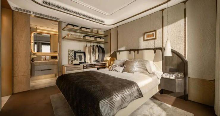 主卧标配约4.6米超大面宽贝母马赛克弧形皮革背景墙,地面采用和保利世博天悦同款的嵌铜荷叶拼地板,且嵌铜花色可以选择。