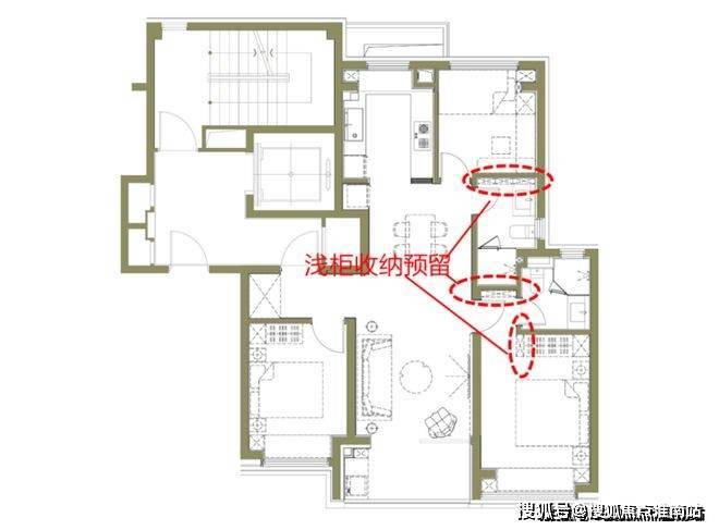特别的是,这个户型的收纳设计走心了。在卫生间的侧面和主卧门背后、大衣柜侧面都预留了放浅柜的位置,收纳日常高频使用的各种小物件会很实用。