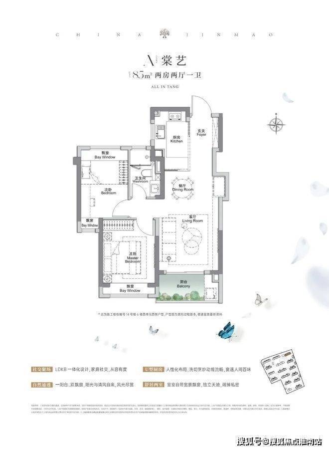 上海宝山金茂棠前营销中心热线4008818994(官方预约热线)建面约85㎡2房2厅1卫,做到了双开间朝南+3个飘窗+LDKB一体化设计,附加空间非常多。