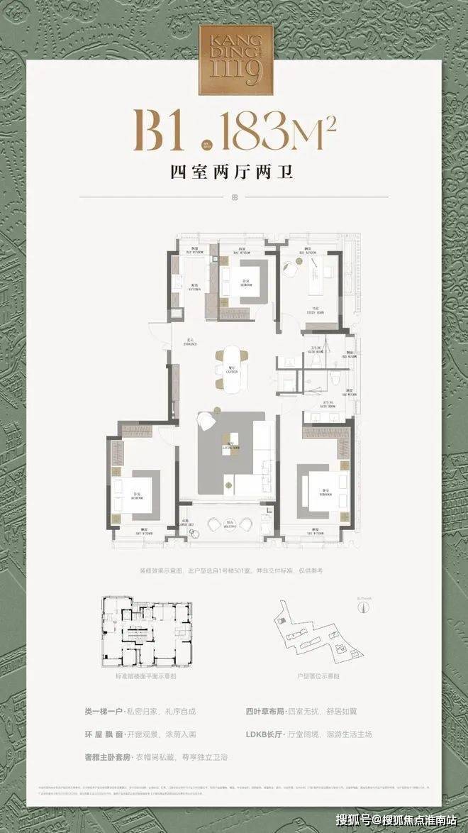 康定壹拾玖售楼中心:400-887-5663建筑面积约1 83㎡户型,类一梯一户设计,电梯厅私密入户,无需路过/被路过同层邻居家门,尊享悦己的静谧;四个房间,适配全家庭结构,从小太阳到三代亲都能轻松托举;标配飘窗,厨房双卫皆明媚,每一处都有阳光与自然的盛情款待;LDKB长厅,打开轩阔的生活舞台,亲友聚会,圈层社交尽显风范;步入式衣帽间,独立卫浴的套房主卧,是给予生活鉴赏家最佳的犒赏。