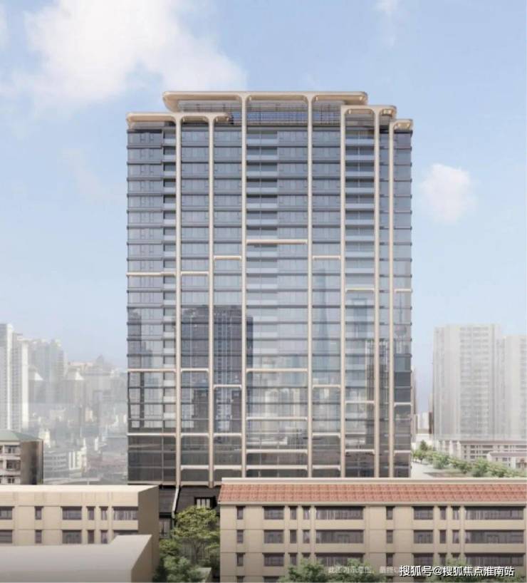 南面以 大面玻璃幕墙为 主体,搭配 香槟金色和深灰色的铝板线条 ,营造海派立面美学。