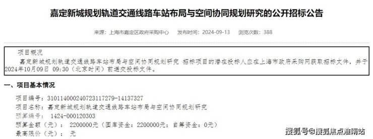 9月13日,上海政府采购网发布《嘉定新城规划轨道交通线路车站布局与空间协同规划研究的公开招标公告》。