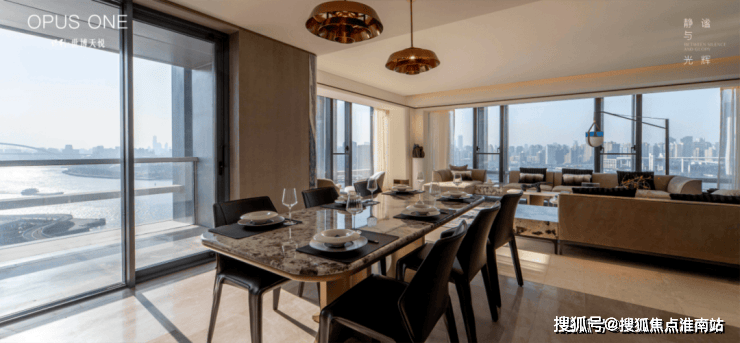 这客厅既是270°全景舱厅,无论全家在餐桌前欢聚一堂,还是孩子们在客厅嬉戏,一抬头便是以江景和城市为主题的巨幅油画。