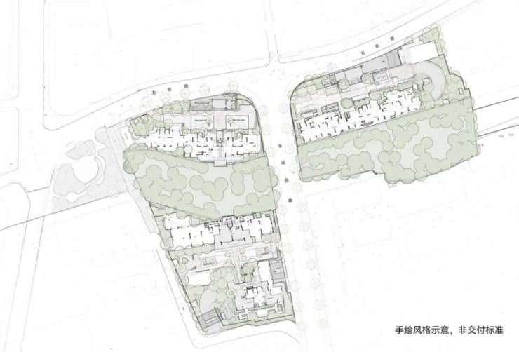 项目通过「柔化边界·城市渗透」的设计手法,以城市微更新的理念,对土地的原生肌理进行有机缝合与编织,借三个地块间的绿轴做自然拼接,构建一轴三园的空间结构,重建家与附近的情感链接。